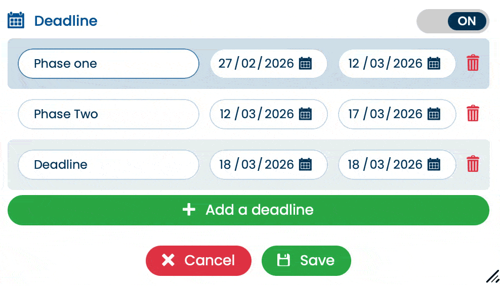 You can add multiple phases to a project using the “+ Add a deadline” button. Each phase corresponds to a key step (e.g. quote, production, client approval…).