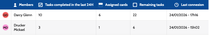 Un tableau vous permet de suivre l’activité de votre équipe en un coup d’œil :